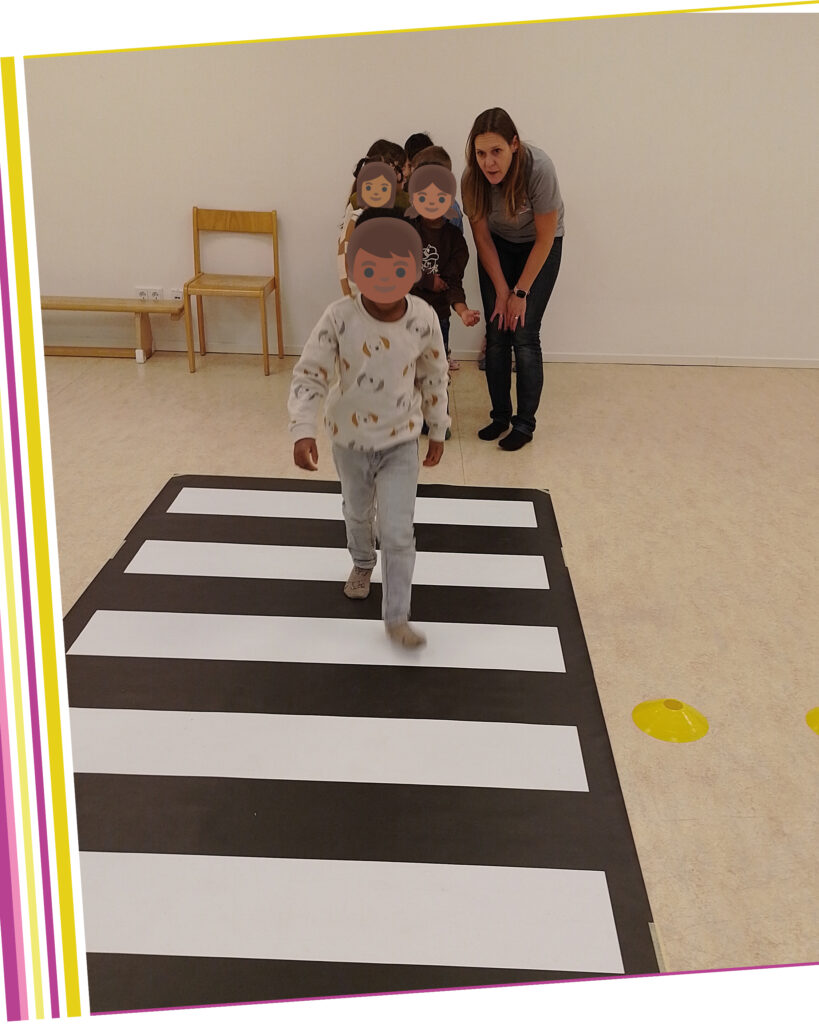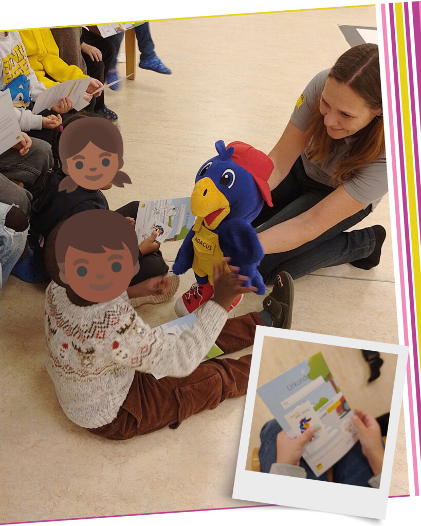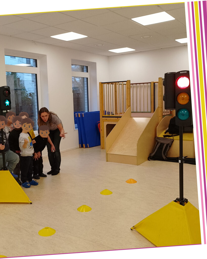 In Zusammenarbeit mit der Polizei und dem ADAC wurde das kindgerechte Trainingsprogramm „Aufgepasst mit Adacus“ durchgeführt. Mit vielen praktischen Übungen lernten die Kinder, wie sie sich sicher im Straßenverkehr bewegen – vom richtigen Überqueren der Straße bis zum aufmerksamen Verhalten an Ampeln und Zebrastreifen.